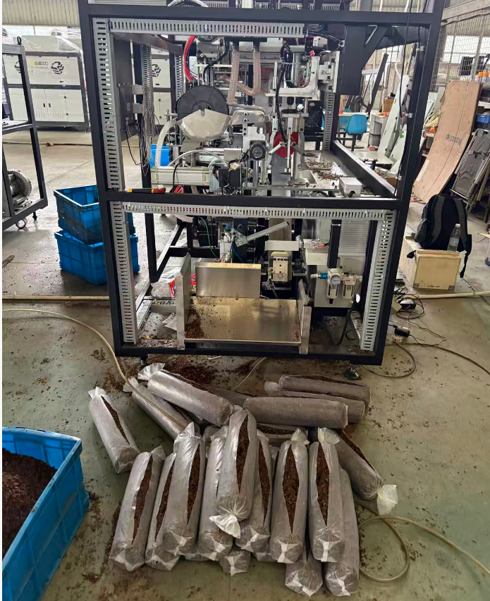 機(jī)器的主要功能是將混合、發(fā)酵好的蘑菇培養(yǎng)料(蘑菇土)自動(dòng)、定量地裝入塑料袋中,為后續(xù)的滅菌、接種環(huán)節(jié)做準(zhǔn)備。它是一個(gè)集輸送、計(jì)量、裝填、壓實(shí)于一體的自動(dòng)化設(shè)備。
